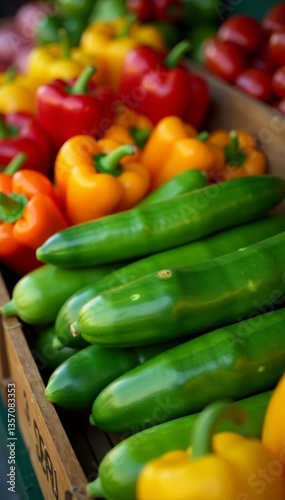 Close-up of freshly harvested cucumbers and bell peppers at a farmers market, nutritious, harvest