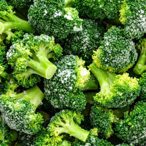 Close-Up of Frozen Broccoli Florets – Green Vegetables with Ice Crystals, Full Frame