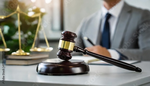 Close-up of gavel on judge’s desk symbolizing court trials, justice system, legal decisions, and judicial authority in a courtroom environment highlighting law and order principles.