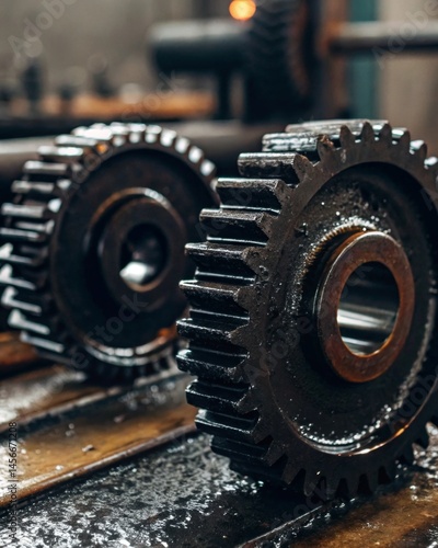 Closeup of gears in motion mechanical workshop high-detail texture industrial environment inside perspective metal components covered in grease