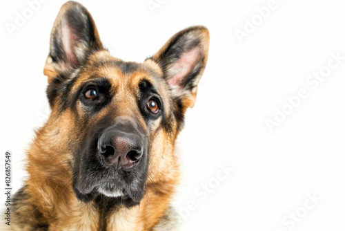Closeup of german shepherd dog looking up at camera on white background pet portrait for animal lovers