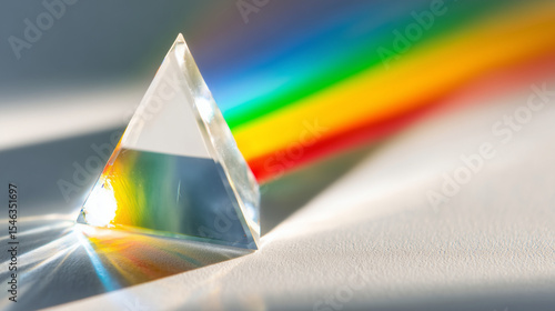 Close-up of glowing prism refracting sunlight into vibrant color bands on minimalist white surface, symbolizing wireless frequency allocation and spectrum analysis.