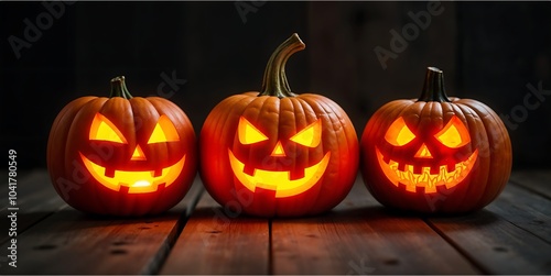 Close-up of glowing pumpkins with spooky carved scary faces in a dark background