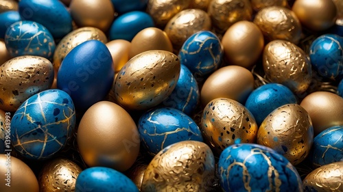 Close-Up of Gold and Blue Easter Eggs in Decorative Frame – Festive Photorealistic Background