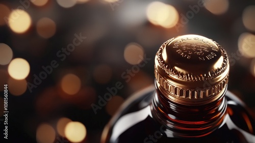 bottle, cap, gold, close, up, bokeh, light, top, lid, metallic, blurred, beverage, drink, shiny, sharpened, seal, background, detail, sparking, illumination, sparkle, glimmer, luxury, reflective, evening, container, glowing, warm, festive, glossy, photogenic, scene, composition, product, cardboard box, flair, elegant, premium, ornate, round, circular, sophisticated, copy space