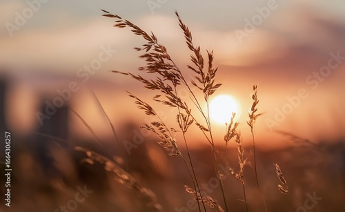 close-up of grass in the foreground, blurry background of a sunset.