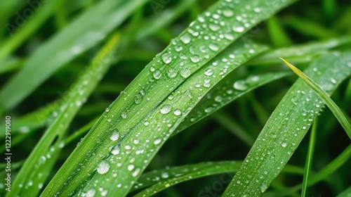 Close-up of green grass blades with dew drops glistening in the sunlight.