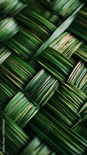 Close-up of green palm leaves woven into an intricate pattern, symbolizing the traditional artistry and craftsmanship