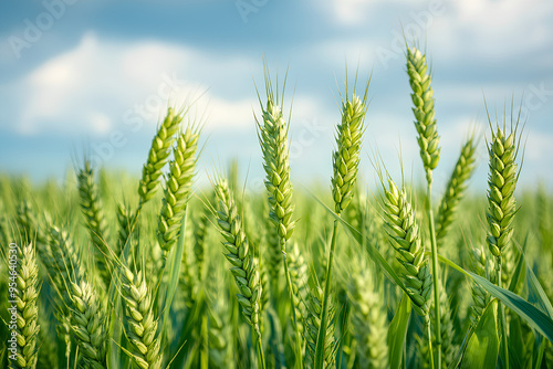 Close-up of green wheat stalks in a field with a blue sky and sunbeams in the background