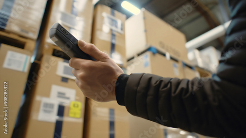Closeup of hand holding digital bar code label laser scanner in warehouse full of boxes. Factory store order check, inventory logistic and shipping equipment, industry business technology reader