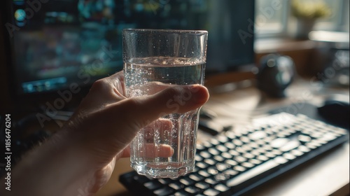 closeup of hand holding glass of water near computer keyboard on wooden desk with blurred monitor and natural light