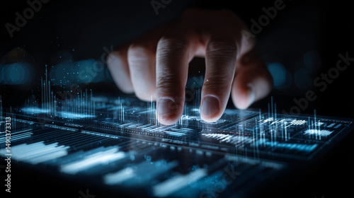 Close-Up of Hand Navigating Futuristic Financial Dashboard Interface