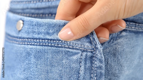Close-up of hand tugging jeans pocket, worn denim, natural hand position