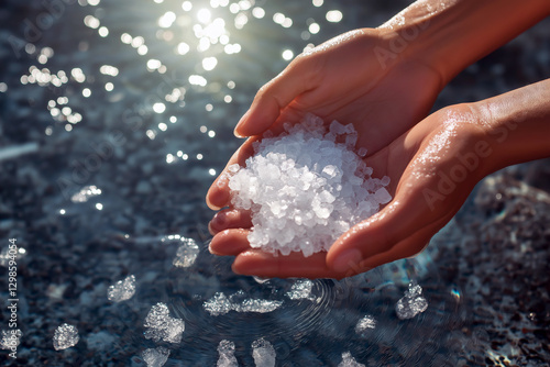closeup, hand, collecting, salt, crystal, shallow, water, pool, droplet, glistening, sunlight, texture, detailed, artisanal, handcraft, coarse, mineral, evaporation, saltworks, industry, natural, organic, production, coastal, seasoning, harvest, men at work, shimmering, bright, contrast, process, wetland, landscape, serene, traditional, purity, delicate, meticulous, craftsmanship