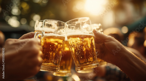 Close-up of hands clinking beer glasses in a toast, celebrating friendship and fun, golden frothy beer, festive moment, social gathering, cheers, casual drinking scene.