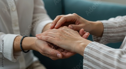 Close-up of hands comforting gesture white sleeve bracelet striped fabric, muted colors soft focus