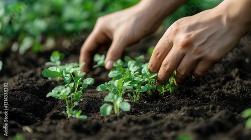 close-up of hands gently planting organic food in dark, moist soil, fresh green sprouts emerging, the essence of natural and mindful farming