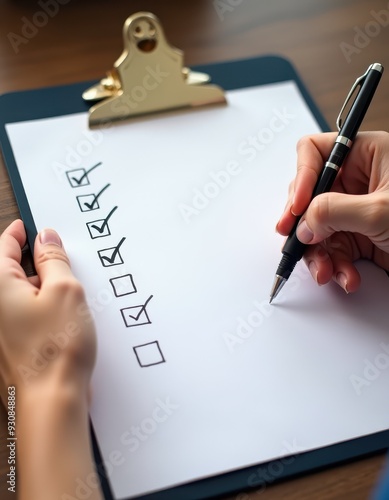 Close-up of hands holding a clipboard and marking checkboxes on a sheet of paper with a pen.