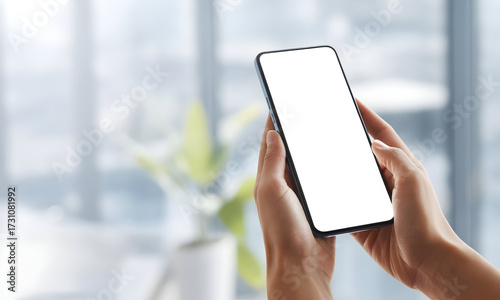 Closeup of hands holding a modern smartphone with blank screen, bright indoor setting