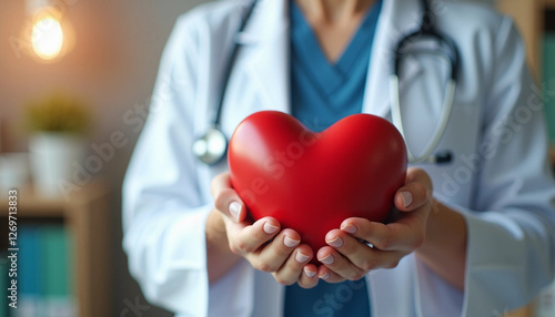 Close-up of Hands Holding a Red Heart-shaped Object, Symbolizing Health and Love, With a Blurred Background of a Doctor’s Office and a Stethoscope,healthy,Psychological consultant,