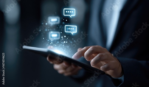 business, communication, technology, tablet, hand, chat, icon, glowing, interface, digital, interaction, modern, virtual, conversation, message, support, feedback, dialogue, engagement, online, social, networking, connectivity, datum, information, sharing, user, life events, touch screen, device, light, dark, blurred, background, person, professional