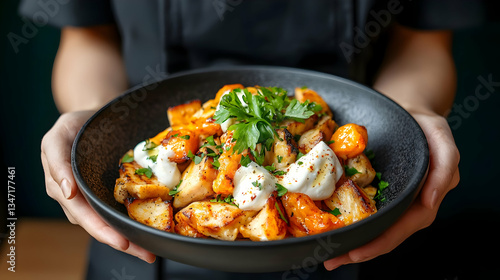 food, dish, meal, cookery, dinner, lunch, roasted, chicken, mango, yogurt, parsley, herb, healthy, delicious, tasty, epicure, eatery, plating, presentation, dark, background, black, bowl, hand, serving, main course, protein, fruit, dairy, receipe, cooking, food photography, culinary, gastronomy, eat, healthy eating, epicure, dark background