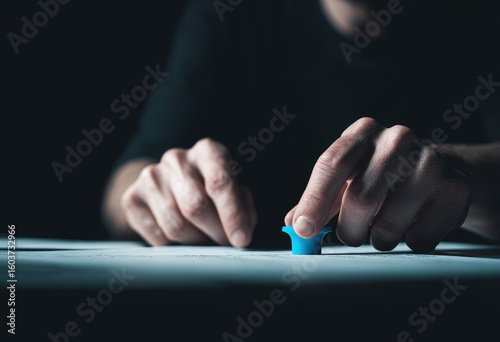 hand, object, blue, small, table, paper, dark, focused, person, man, close, up, detail, human, moody, concentrating, thoughtful, work, process, action, sharpened, light, shadow, manipulation, control, precision, effort, strategy, problem, solving, puzzle, decision, task, thought, planning, design