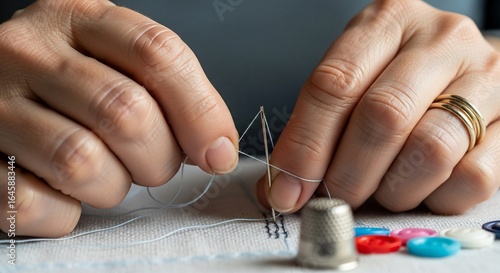 hand, finger, needle, thread, thimble, buttons, fabric, sewing, stitching, mending, tailoring, handcraft, hobby, precision, detail, sharpened, patience, skill, tradition, domestic, hand-made, bricolage, textile, art, creativity, repair, white, silver, gold, colourful, red, blue, pink, closeup, macro, texture, light, indoor, adult, home, leisure, work, project, fashion, design, dressmaking, tailor, dressmaker