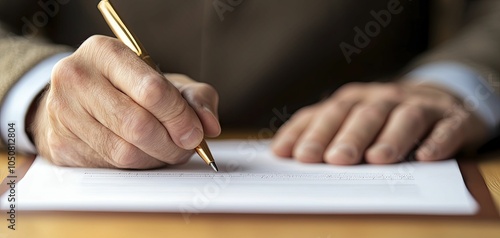 Close-up of hands signing a constitution, symbolizing political authority, intricate details, intentional framing, inviting hues.