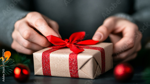 Close-up of hands tying a red ribbon on a beautifully wrapped Christmas gift with festive decorations nearby