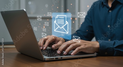 Closeup of hands typing on laptop with floating envelope icons symbolizing emails