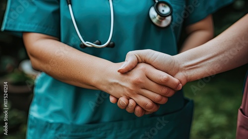 Close-up of handshake between two healthcare providers, highlighting professional teamwork.