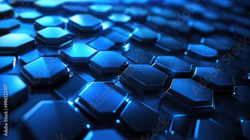 Close-up of hexagonal metallic shapes in a vibrant blue hue, creating a dynamic and futuristic texture.