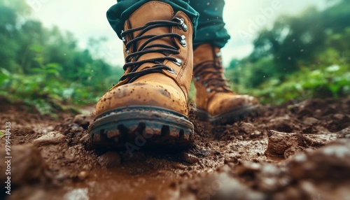 Close-Up of Hiking Boots on a Muddy Trail, Embracing the Adventure with Every Step The Dirt and Rocks Underfoot Reflect the Excitement of the Journey Feel the Adrenaline Rush as You Conquer the
