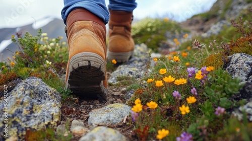 Close-up of Hiking Boots on Rocky Trail with Wildflowers and Moss | Outdoor Adventure and Exploration Concept