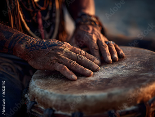 close-up of Indigenous man's hands beating a ceremonial drum, Warm evening light