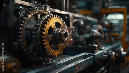 gear, metal, industrial, machine, machinery, factory, technology, engineering, mechanic, manufacturing, spinning, motion, movement, rotation, precision, industry, work, equipment, tool, component, system, steel, iron, bronze, old, vintage, rust-eaten, worn, grit, dark, shadow, detail, texture, closeup, macro, photo, sharpened
