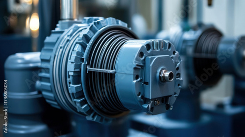 industrial, machine, component, blue, metallic, gear, coil, closeup, equipment, machinery, device, engineering, technology, manufacturing, steel, mechanical, motor, industry, part, fabrication, power, apparatus, hardware, torque, mechanism, assembly, construction, production, tool, factory, plant, engine, electric, detail, new, generator