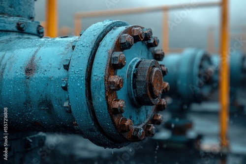 industrial, pipe, fitting, machinery, metal, rust-eaten, wet, water, droplet, nut, bolt, connection, pressure, equipment, infrastructure, manufacturing, engineering, maintenance, construction, pipeline, oil, gas, technology, power, energy, system, detail, close, sharpened, blue, grey, orange, hardware, component, joint, exterior, damp, heavy, hard-wearing, strength, robust, modern, utility, process, facility