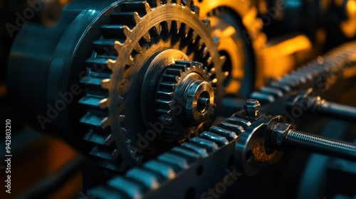 gear, gear, cog, cog, metal, steel, iron, industrial, machine, machinery, engineering, mechanical, mechanism, component, part, equipment, factory, workshop, manufacturing, production, industry, technology, automation, power, force, motion, movement, transmission, drive, shaft, bolt, nut, screw, rod, macro, detail, texture, abstract, background, dark, light, shadow, contrast, blue, teal, gold, yellow, brown