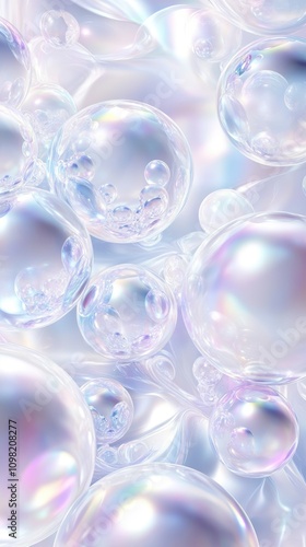 Close-up of iridescent bubbles floating in a soft, dreamy background of translucent colors.