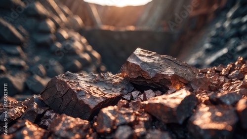 Close-up of iron ore texture - natural minerals found in mining sites. Rock texture from an open pit. Extraction of minerals for industrial use - showcasing the mineral composition of rocks contain...