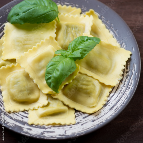 ravioli, square, pasta, boiled, dough, italian, ricotta, cheese, stuffing, gastronomy, italian food, italian culture, traditional, cooked, prepared, epicure, natural, organic, food, foodstuff, nobody, indoor, closeup, closeup, studio shot, plate, brown, dark, ceramic, basil, green, leaf, herb