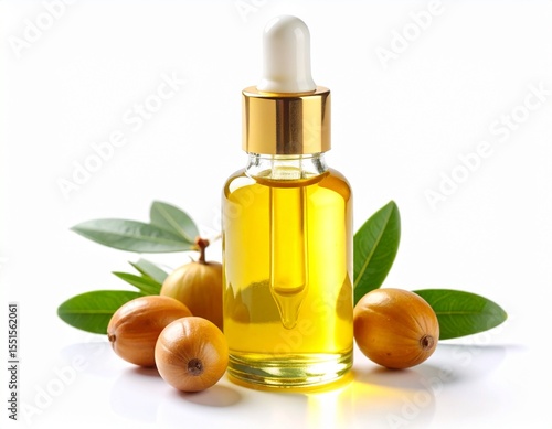 Close-up of jojoba oil in a clear bottle or dropper, emphasizing its rich color and luxurious texture. Perfect for cosmetics, aromatherapy, and organic product branding, jojoba oil in white backgroun