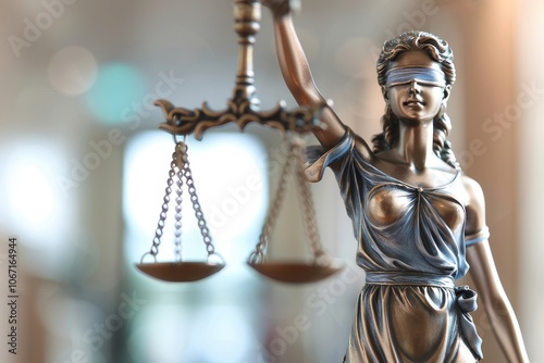 Close-up of Lady Justice statue with scales in a blurred courtroom background