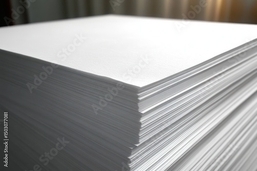 Close-up of large stack of clean, white paper sheets neatly piled with soft lighting