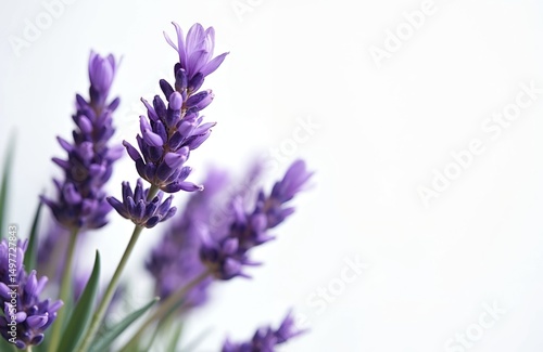 Close-up of lavender flower on white background. Focus on gentle curves and subtle hues of purple blossoms. Image evokes sense of tranquility. Ideal for aromatherapy, cosmetic product, floral design.