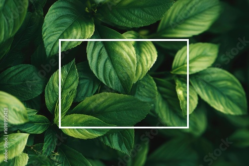 Close-up of lush green leaves, framed by a white rectangle
