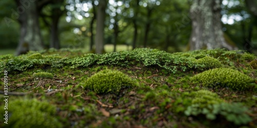Close-up of lush green moss covering forest floor with trees in the background, creating a serene and natural woodland scene.