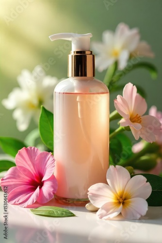 Close-up of luxurious lotion bottle with fresh flowers and green leaves, reflecting a pampered and healthy lifestyle , serenity, premium, soothing